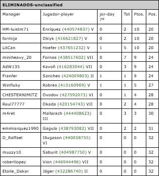 Llega la jornada 7 de liga. Solo seguirán participando en el Pichichi (XIII) los 20 primeros clasificados. Los demás serán eliminados.